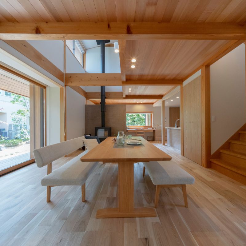 無垢の床、塗り壁、自然光。素材そのもののぬくもりが、家族の暮らしをやさしく包みます。